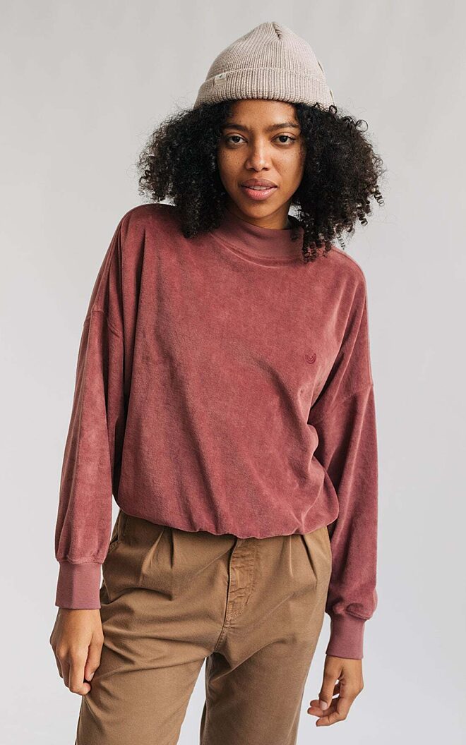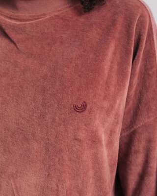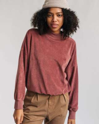 Gemaakt van de hoogwaardigste en zachtste biologische fluweelstof, is de Binz, met zijn mooie naam, een milieuvriendelijke sweater met verlaagde schoudernaden en een geborduurd merkembleem.