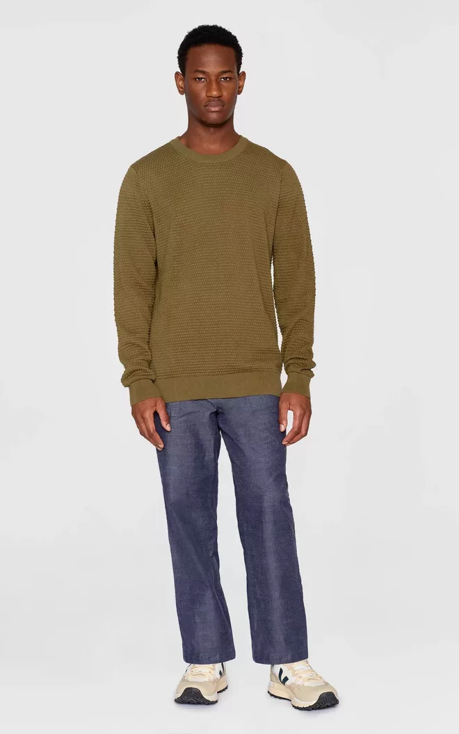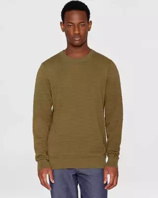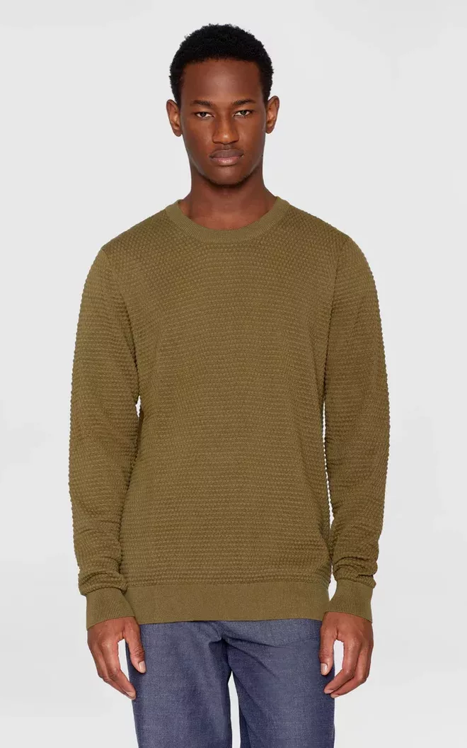 Deze gebreide trui met ronde hals is gemaakt van 100% biologisch katoen met een klein bubbelpatroon en heeft een normale pasvorm. Het eenvoudige ontwerp is afgewerkt met een ronde ribboord bij de hals, ribboorden bij de mouwen en een ribboord aan de onderkant.