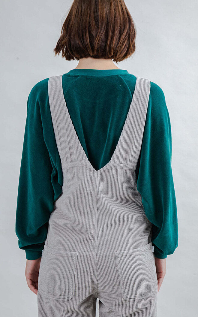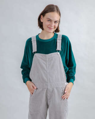 Ontdek de ultime mix tussen comfort en karakter met deze grijze corduroy salopette. Hij is het perfecte stuk voor in je kast dankzij het zachte biologisch katoen en de relaxte snit.