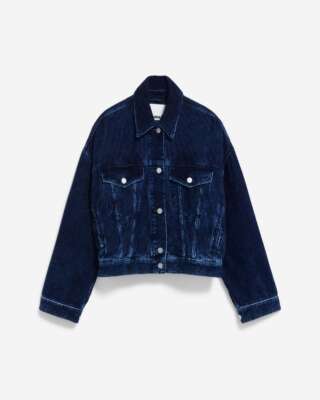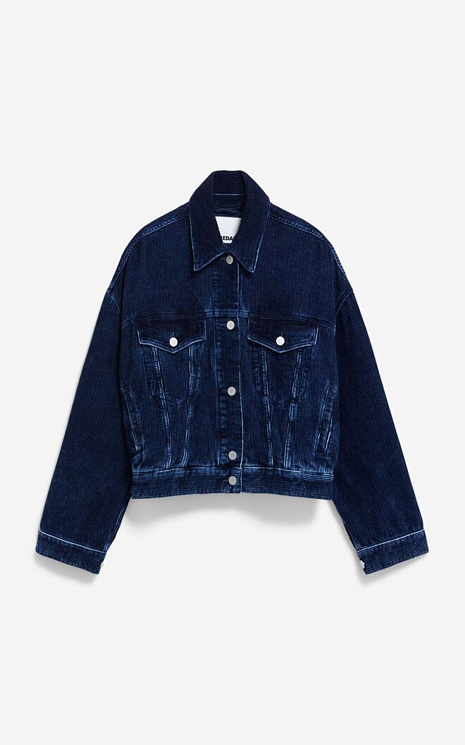 The PAASITHE INDIGO CORD jacket combines a wide, cropped fit with a classic shirt collar and sturdy corduroy fabric made of organic cotton. Pleats at the waist, piped pockets and a button closure underline the relaxed look.