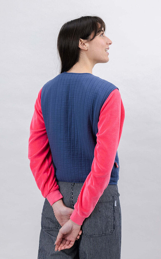 A versatile piece with effortless charm. The Quilt Vest Woman Indigo is a lightweight layer with a soft, quilted structure that moves with you. Style it over shirts or knits and bring depth to your daily wardrobe. Made from organic cotton for mindful comfort.